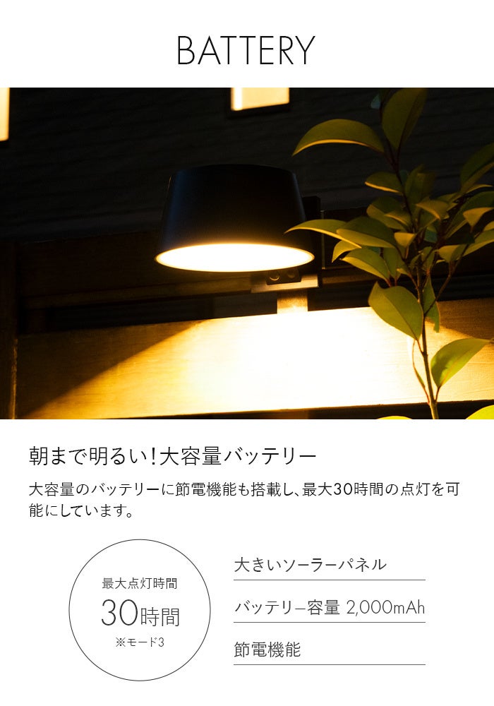 朝まで明るく点灯。大容量のバッテリーと節電機能により、最大30時間という長時間の点灯を可能にしています。