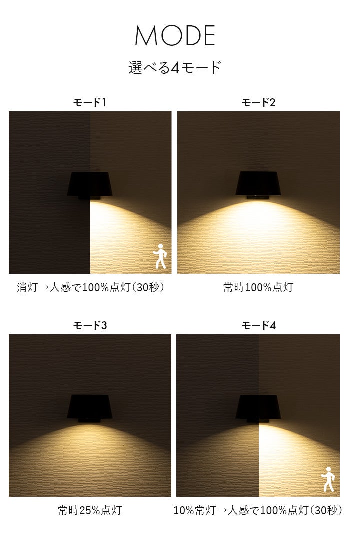 4種類の点灯モードを用途に合わせてご利用いただけます。モード切替はライト正面のスイッチから操作できます。