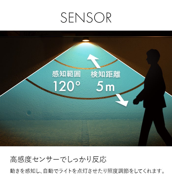 高感度な人感センサーで防犯や帰宅時にもぴったり。感知する範囲は120°、距離は5mと広範囲です。