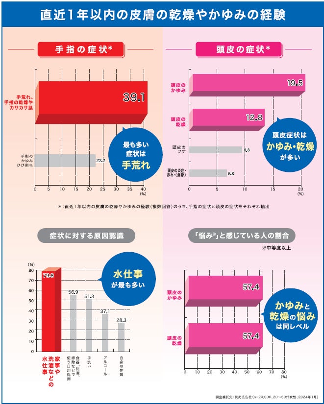 皮膚の乾燥やかゆみの経験についての調査※によると、直近1年以内に経験した症状で、手荒れ・手指の乾燥やカサカサ肌の症状が39.1%と多く、その原因として水仕事を挙げる方が最多でした。また、頭皮のかゆみや乾燥、フケ、炎症・赤み(湿疹)など、いずれかの頭皮症状を抱える方は26%で、頭皮のかゆみや乾燥の悩みが上位を占めました。