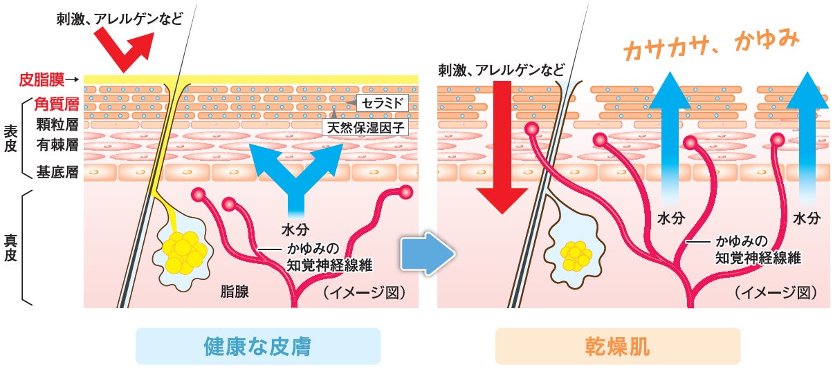 季節的な空気の乾燥、加齢による皮脂分泌の低下、洗いすぎやアルコール消毒により皮膚は乾燥しバリア機能が低下します。放置すると、皮膚の防御反応によりかゆみの知覚神経繊維が表皮に入り込み、少しの刺激でもかゆみを感じる(過敏)ようになります。