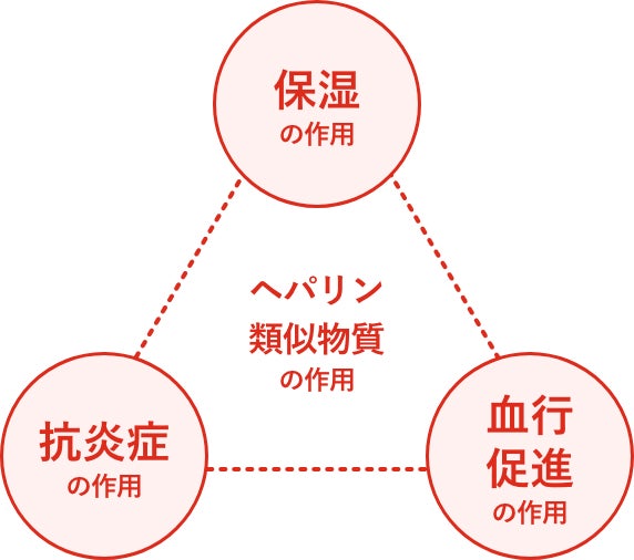 親水性を持つヘパリン類似物質は水分子を引き寄せ保持する保水性に優れ、皮膚の奥まで浸透し保湿する効果があるため、乾燥による皮膚炎などに対して効果を発揮します。保湿効果のほか、血行促進、抗炎症効果をあわせ持っています。