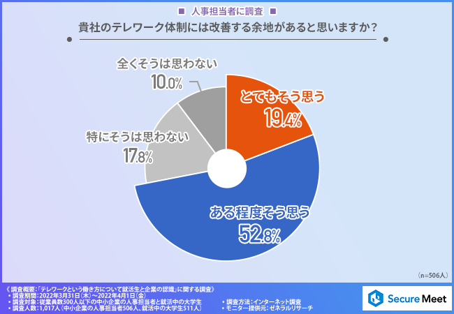 7割以上の人事担当者が、自社のテレワーク体制に改善の余地があると考えているようです。