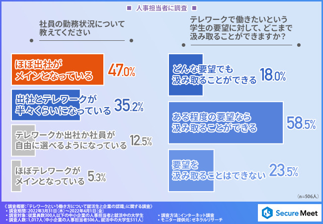 また、7割以上の人事担当者がテレワーク希望の学生を歓迎しているものの、反対意見も寄せられました。