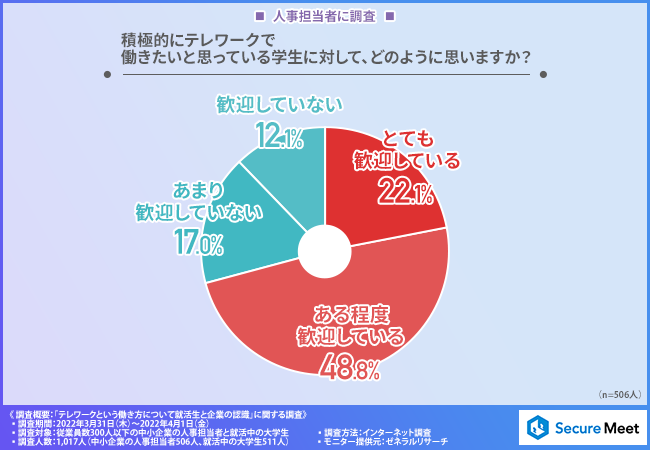 そこで、人事担当者を対象に、「積極的にテレワークで働きたいと思っている学生に対して、どのように思いますか?」と質問したところ、7割以上の方が『とても歓迎している(22.1%)』『ある程度歓迎している(48.8%)』と回答しました。