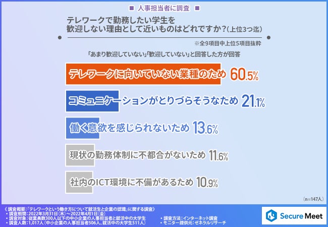 そこで、先ほどの質問で『あまり歓迎していない』『歓迎していない』と回答した人事担当者に対し、「テレワークで勤務したい学生を歓迎しない理由として近いものはどれですか?(複数回答可)」と質問したところ、『テレワークに向いていない業種のため(60.5%)』と回答した方が最も多く、次いで『コミュニケーションがとりづらそうなため(21.1%)』『働く意欲を感じられないため(13.6%)』と続きました。