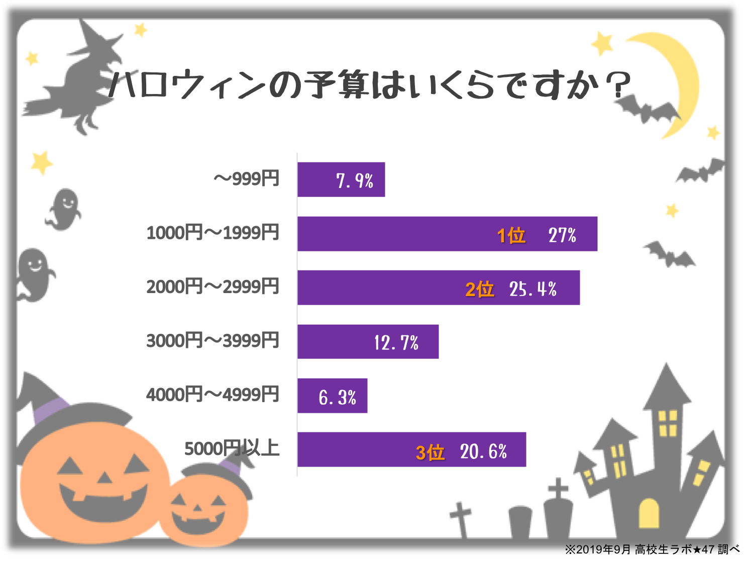 高校生のハロウィン予算は、1位「1000円〜1999円」 2位「2000円〜2999円」 3位「5000円以上」となりました。