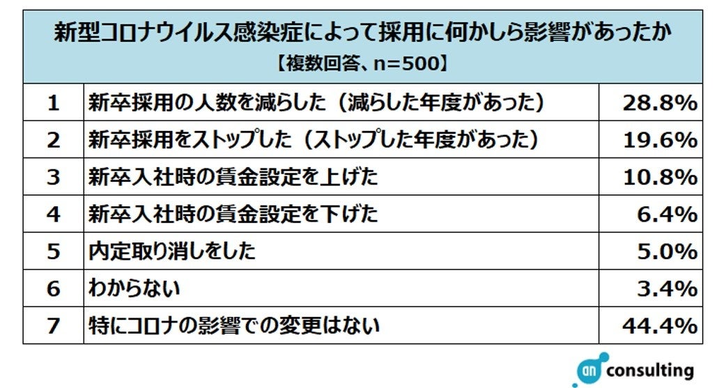 ■コロナによって「新卒採用の人数を減らした(減らした年度があった)」28.8%、「新卒採用をストップした(ストップした年度があった)」19.6%