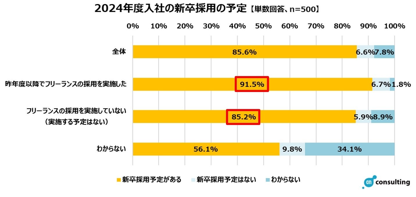 また、Q7フリーランスの採用状況別にみると、「昨年度以降フリーランスの採用を実施」と回答した企業の方が、「フリーランスの採用を実施していない(実施する予定はない)」と回答した企業に比べて、新卒採用を積極的に行う予定のところが多いようです。