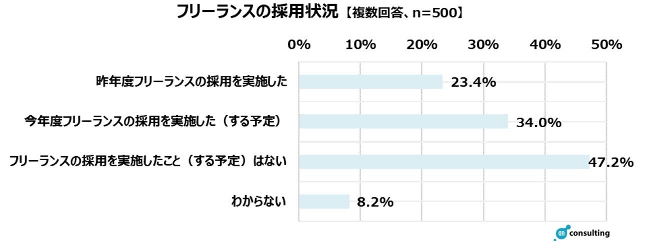また、フリーランスの採用状況については、「昨年度フリーランスの採用を実施」が23.4%、「今年度フリーランスの採用を実施した(する予定)」が34.0%と、昨年に比べると10.6ポイントも増えており、フリーランスの採用について前向きに検討していることがわかりました。8割以上の企業が人員不足を感じている中、フリーランスの採用は企業にとって人員不足解消につながる一つの手段になるかもしれません。