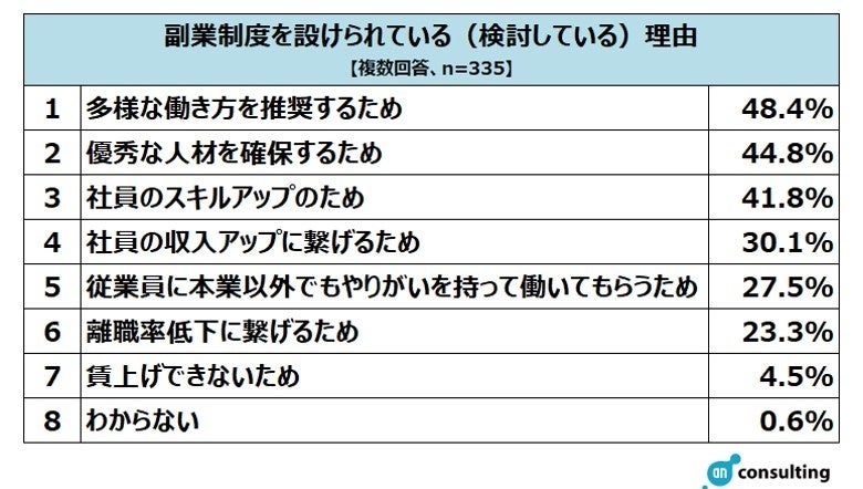 副業制度を導入・または検討中の企業に対して、副業制度を設けている(検討している)理由について聞いたところ、「多様な働き方を推奨するため」48.4%、「優秀な人材を確保するため」44.8%、「社員のスキルアップのため」41.8%と続きました。