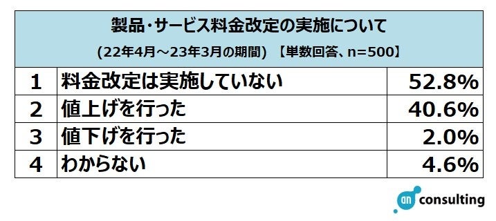 では、製品・サービスの料金改定(22年4月~23年3月の期間)についてはどうでしょうか。最も多かった回答は「料金改定は実施していない」52.8%で、「値下げを行った」企業は2.0%に対し、「値上げを行った」企業は40.6%でした。