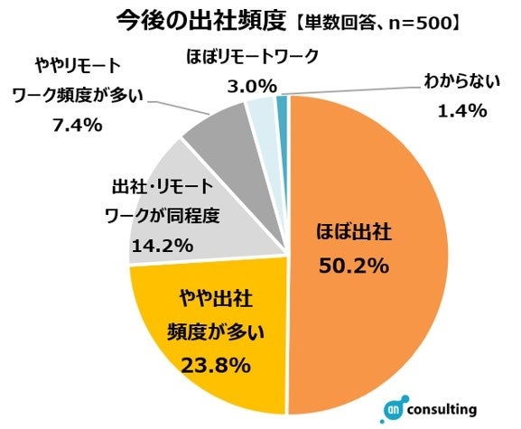 また、今後の出社頻度についても聞いたところ、「ほぼ出社」が50.2%、「やや出社頻度が多い」23.8%とあわせて74.0%の企業で出社が多い働き方になることがわかりました。