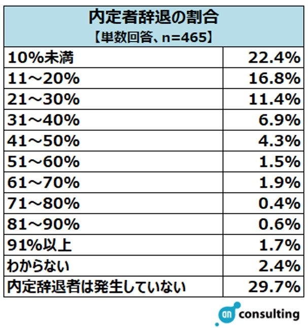 Q5. あなたの企業で10月以降に内定辞退は発生しましたか。発生した場合、内定者数のうちどの程度の割合で内定辞退者がいたかお答えください。(単数回答、n=465)