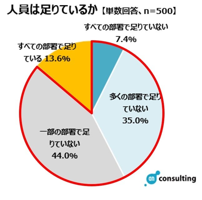 (「多くの部署で足りていない」35.0%、「一部の部署で足りていない」44.0%、「すべての部署で足りていない」7.4%)