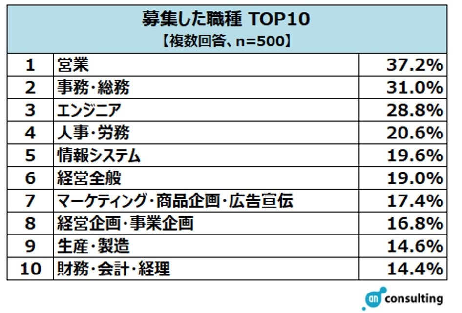 2023年度入社の新卒採用において、募集した職種を聞いたところ、1位「営業」37.2%、2位「事務・総務」31.0%、3位「エンジニア」28.8%でした。続いて4位「人事・労務」20.6%、5位「情報システム」19.6%でIT関連の職種がTOP5にランクインしました。