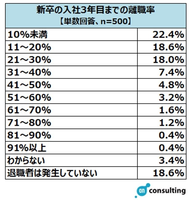 Q1で2023年度入社の新卒採用について「新卒採用を実施し、実際に入社した」、「新卒採用を実施し、内定を出したが入社しなかった」と回答した方へ内定辞退が発生したか聞いたところ、67.9%の企業で内定辞退があったことがわかりました。また、新卒の入社3年目までの離職率についても聞いたところ、TOP3は「10%未満」22.4%、「11~20%」18.6%、「21~30%」18.0%でした。