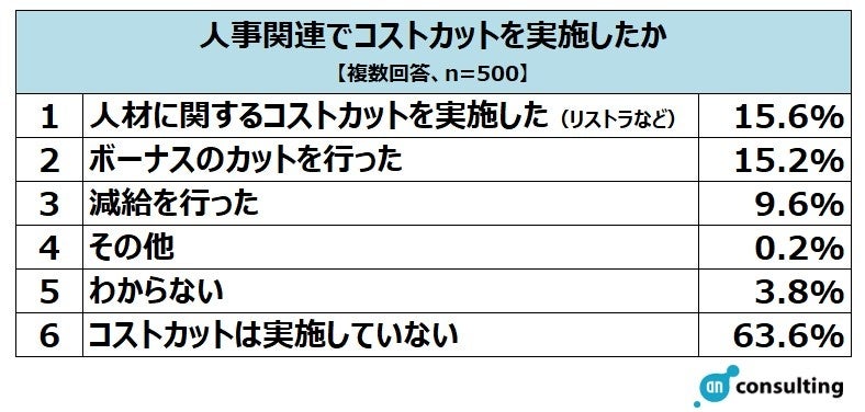 また、人事関連でコストカットしたか聞いたところ「人材に関するコストカットを実施した(リストラなど)」15.6%、「ボーナスのカットを行った」15.2%、「減給を行った」9.6%と多くの企業でコストカットが実施されたようです。