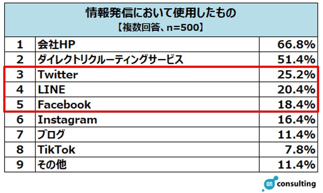 ~新卒採用の情報発信で使用したもの「企業HP」が最多。続いて「ダイレクトリクルーティングサービス」、「Twitter」、「LINE」がランクイン。SNSの活用に今後注目か。~