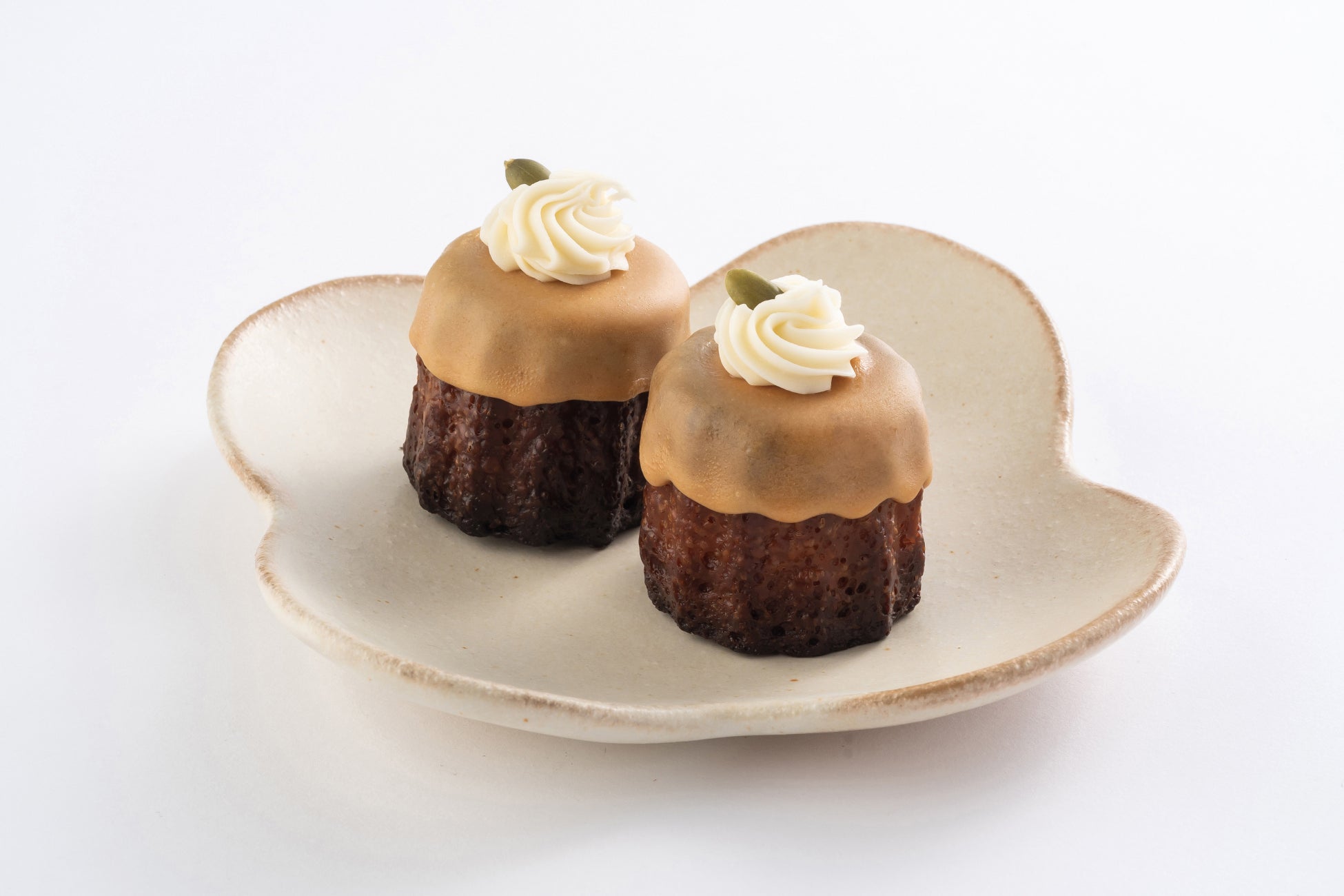 かぼちゃ風味のカヌレに、キャラメル味のチョコをデコレーション。ホワイトチョコのガナッシュとかぼちゃの種をトッピング。