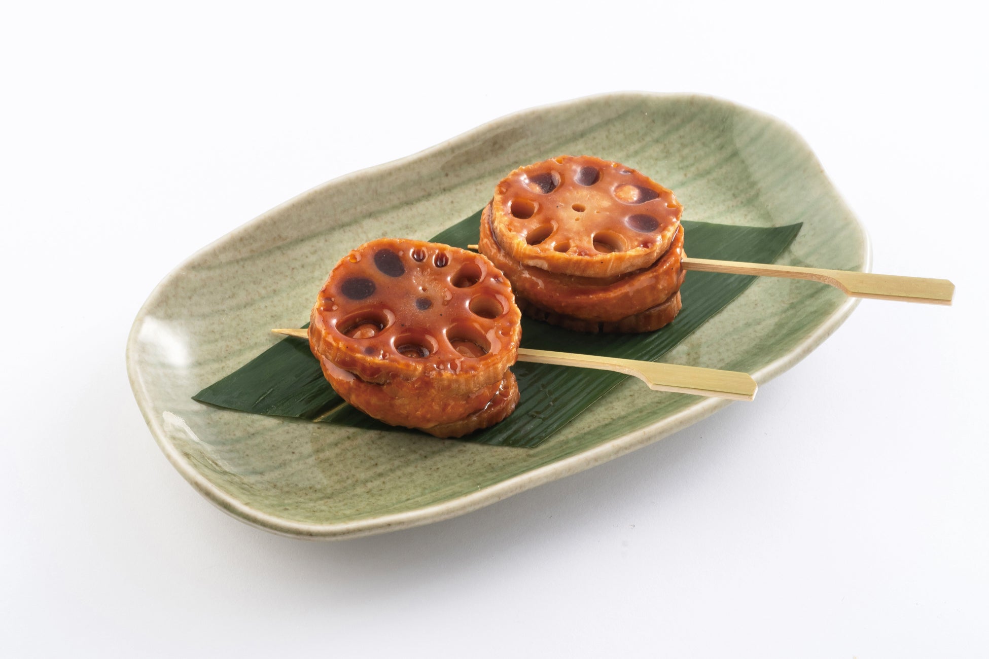 かねふく社の明太子バラコを使った、明太子味の鶏つくねをレンコンではさんで焼きました。シャキシャキのレンコンと 明太子の辛みがピリリと効いたつくねはお酒にもよくあいます。