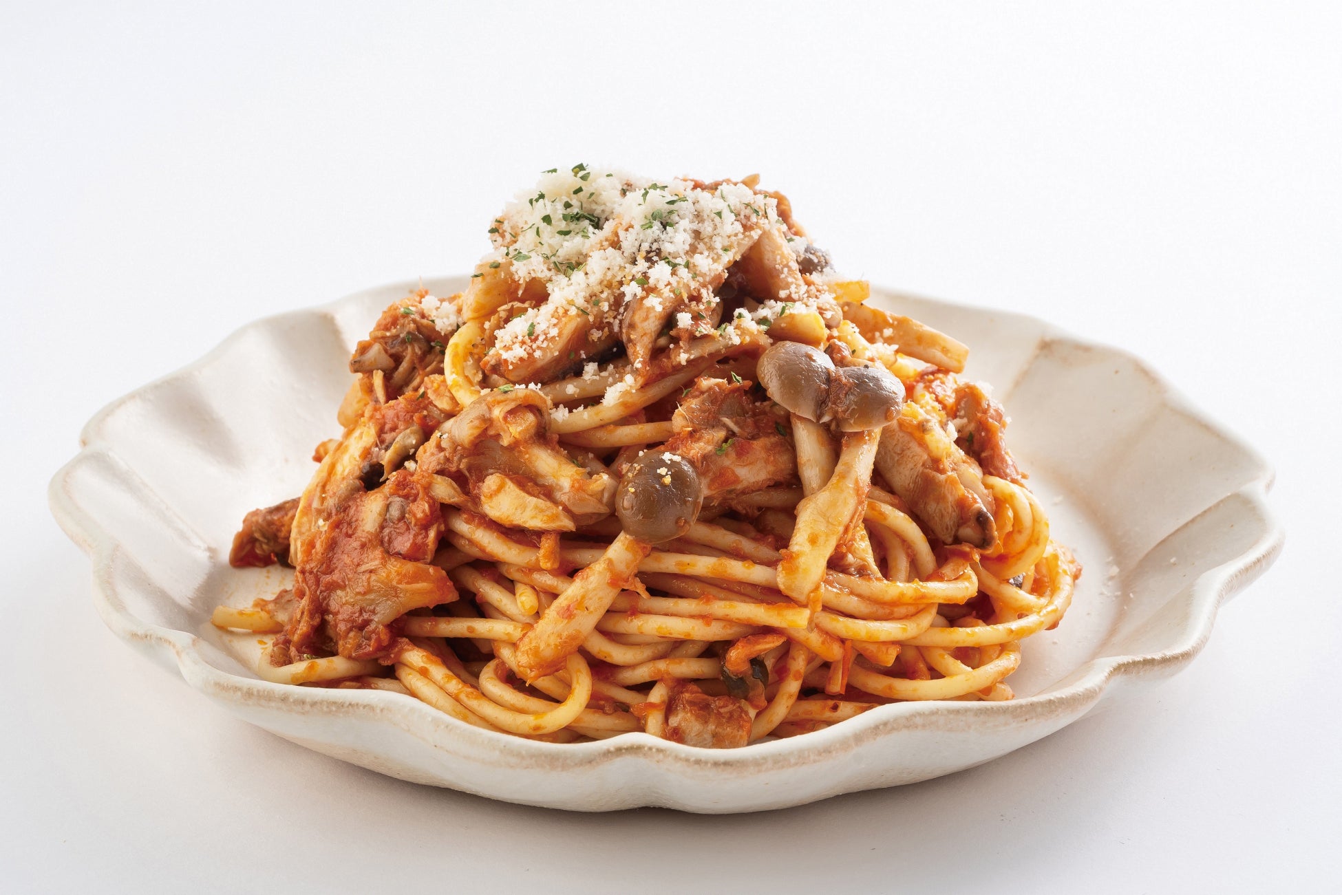 ツナの旨味とキノコの香りがトマトソースに溶け込んだ、ヘルシーで満足感あふれる一品。トマトの酸味でさっぱりしながらも深いコクが広がる本格的なパスタです。