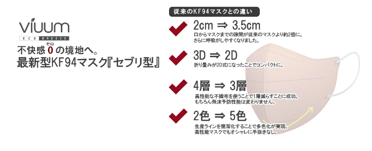 そのKF94マスクがもっと使いやすく快適におしゃれも楽しめるよう開発されたのが最新型KF94 2Dマスク『Viuum(ビウム) です。