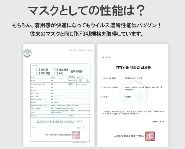 韓国食品医薬品安全処が医薬部外品として許可した保健用マスクで3層になっても飛沫予防機能は変わりません。