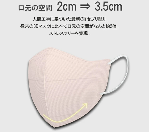 口元の空間が従来のマスクより広くなり、さらに呼吸がしやすく、リップなどがマスクに付きにくい。
