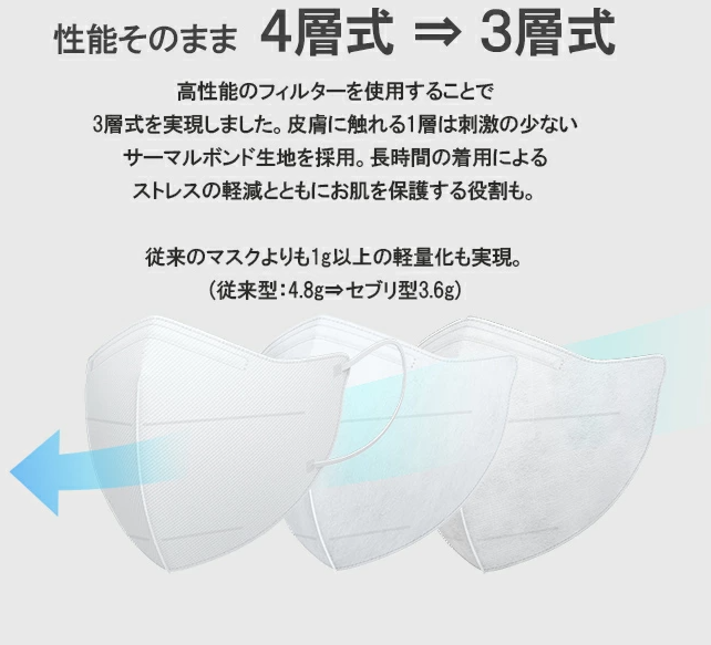 高性能フィルターを使用することで3層式を実現。長時間の着用によるストレスの軽減やお肌の保護する役目も。