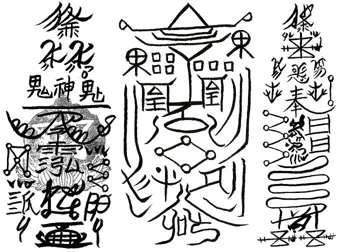 ◆本書を護る霊符(左)/災いを弾くの霊符(中)/家の中の邪悪な霊を鎮める霊符(右)