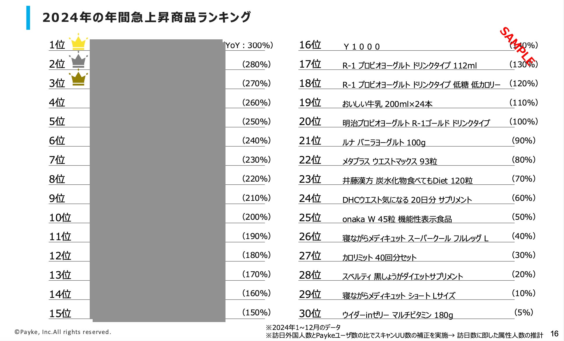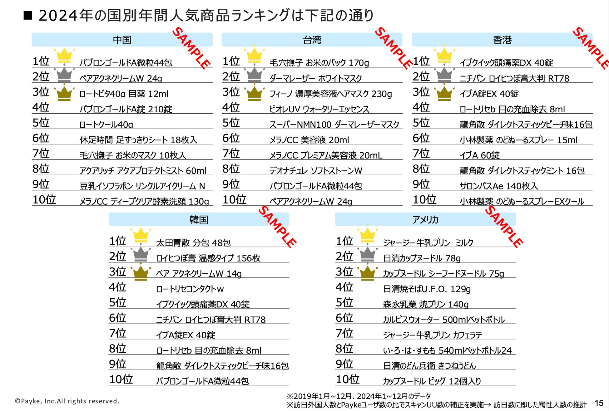 株式会社Payke(本社:沖縄県那覇市、代表取締役CEO:古田 奎輔)は、訪日外国人が手に取った商品に関する詳細なデータを分析し、企業のマーケティング戦略に役立てる「2024年完全版 インバウンド商品データパッケージ」の販売を開始しました。本データパッケージは、訪日外国人が実際に関心を持った商品データを提供し、メーカー、広告代理店、調査会社、自治体などの業務に幅広く活用いただけます。