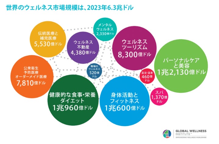 Global Wellness Instituteの発表によると、世界のウェルネス市場規模は6.3兆ドルに達し、身体活動とフィットネスは、1兆600億ドルで、ウェルネス市場のカテゴリーのうち、3番目に大きな市場となっています。