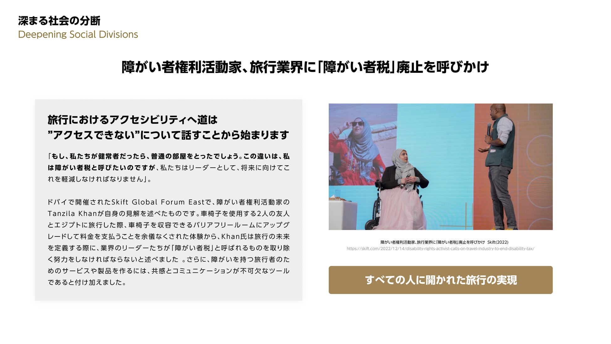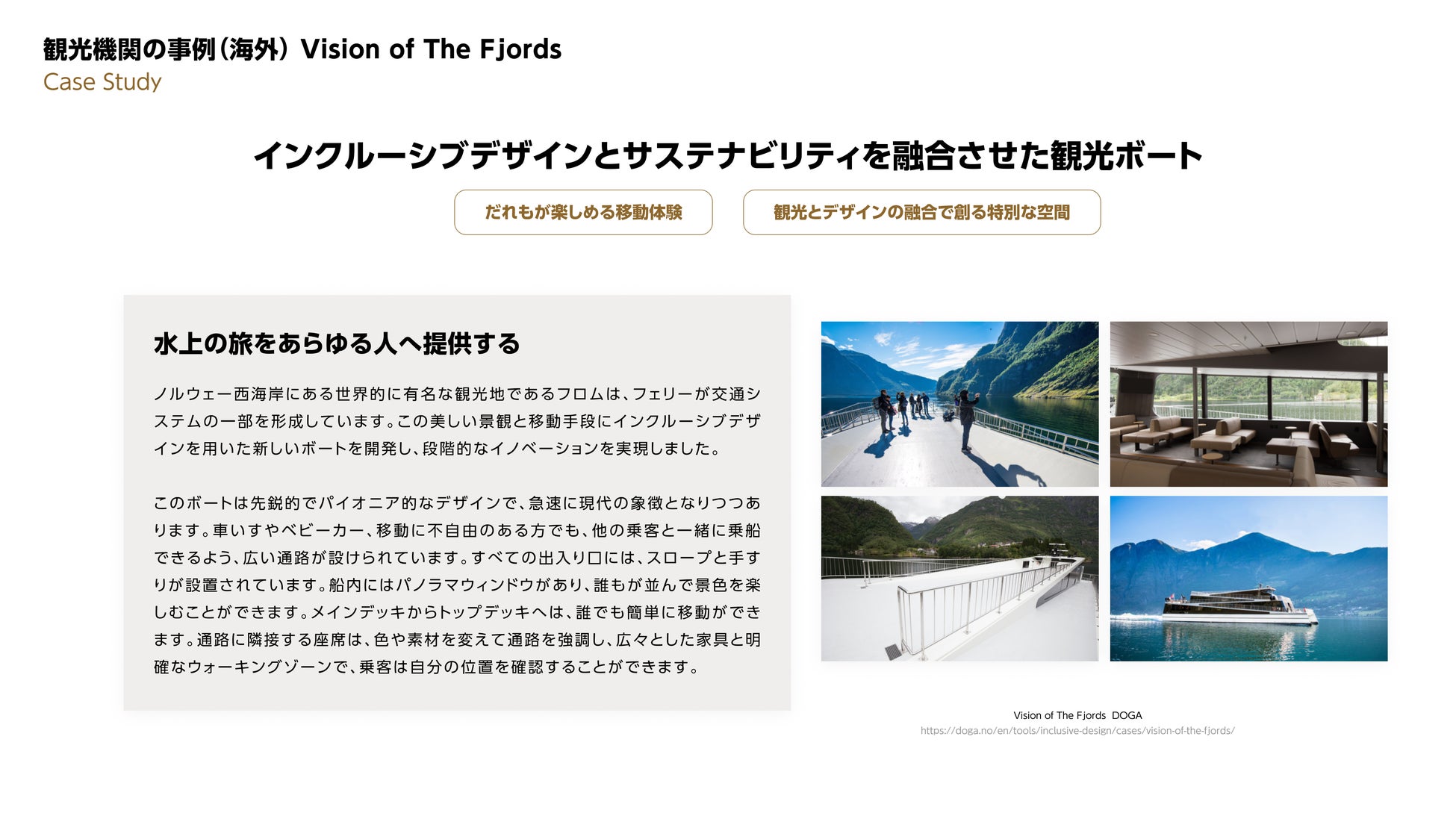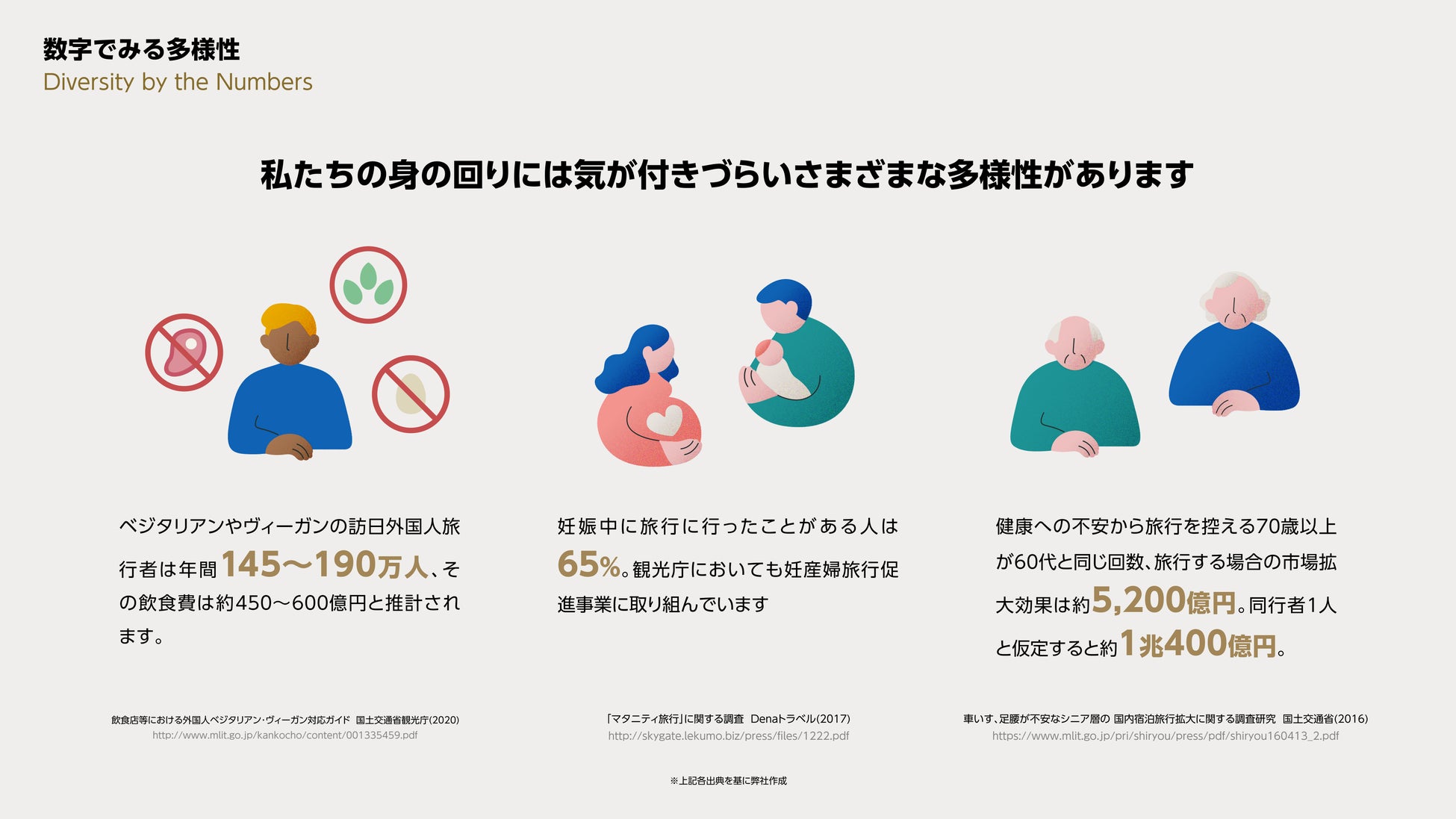 特に、これから日本が直面する超高齢社会や世界で約13億人を超える障がいを抱える方、また、さまざまなライフステージの方が利用する旅行をどのような形でアップデートし、すべての方に開かれた観光体験を創造することが業界全体の持続的発展の鍵となります。このような背景をふまえ、観光業界全体のサスティナブルな事業構築と企業の独自性をもたらすキーファクターとして「インクルーシブデザイン×観光」の可能性を国内外の事例とともにまとめました。