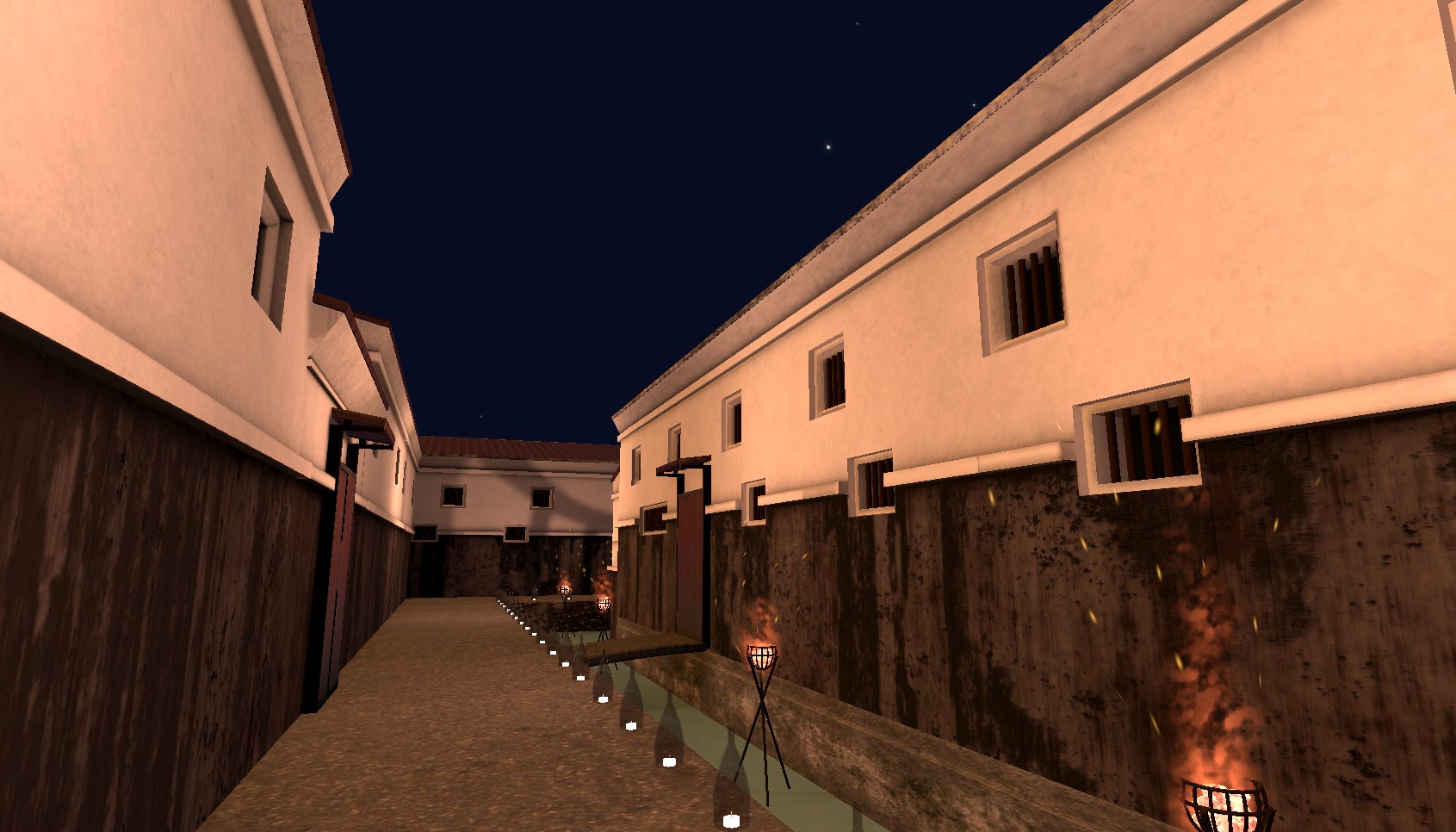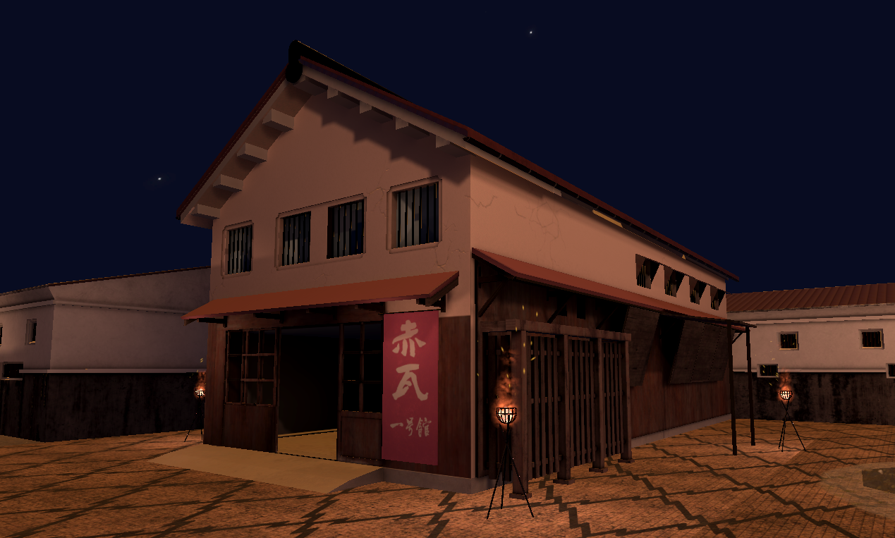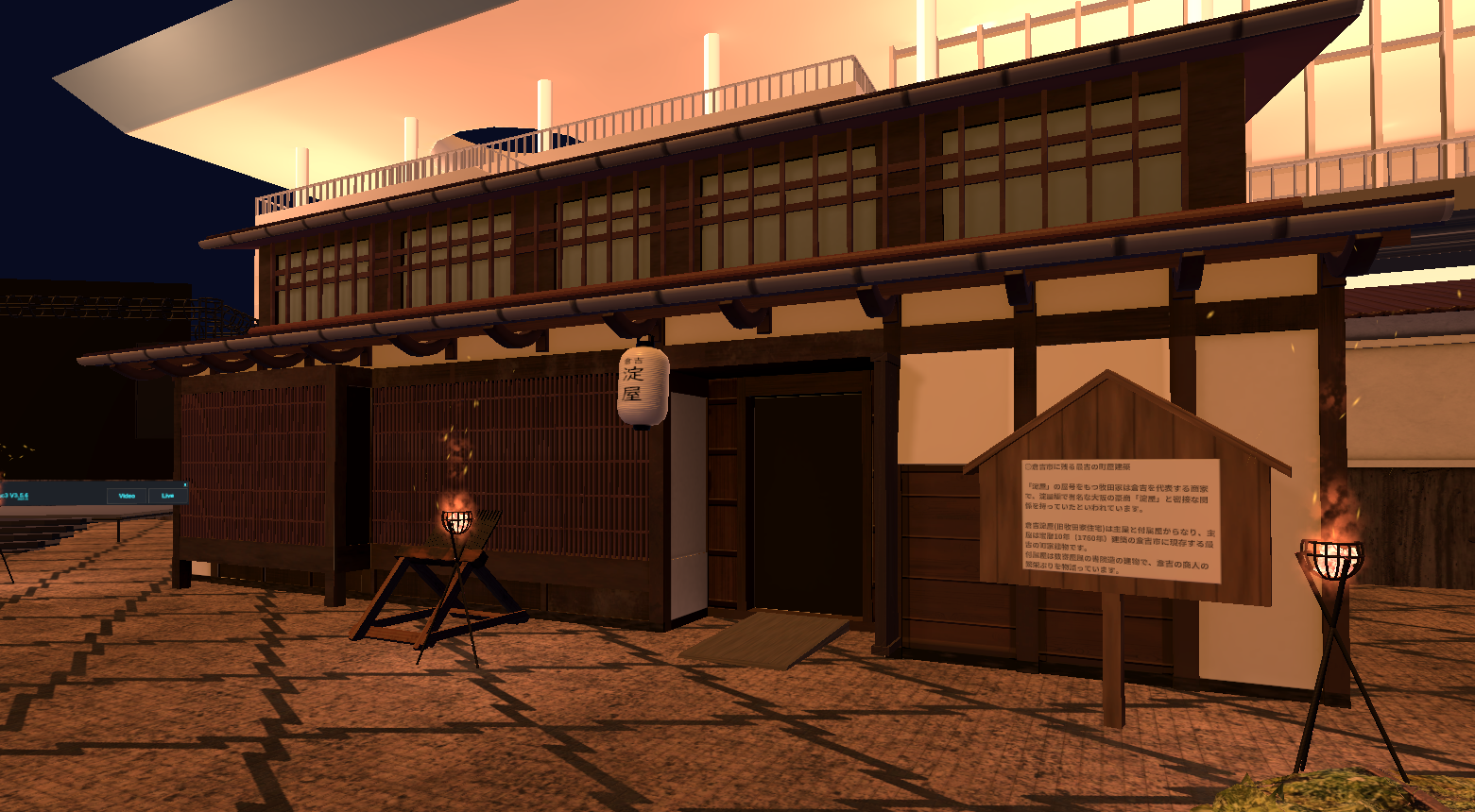 (メタバース上の「白壁土蔵群」。流れる川の水流音も現地の音を収録・加工し、メタバース制作に活用)