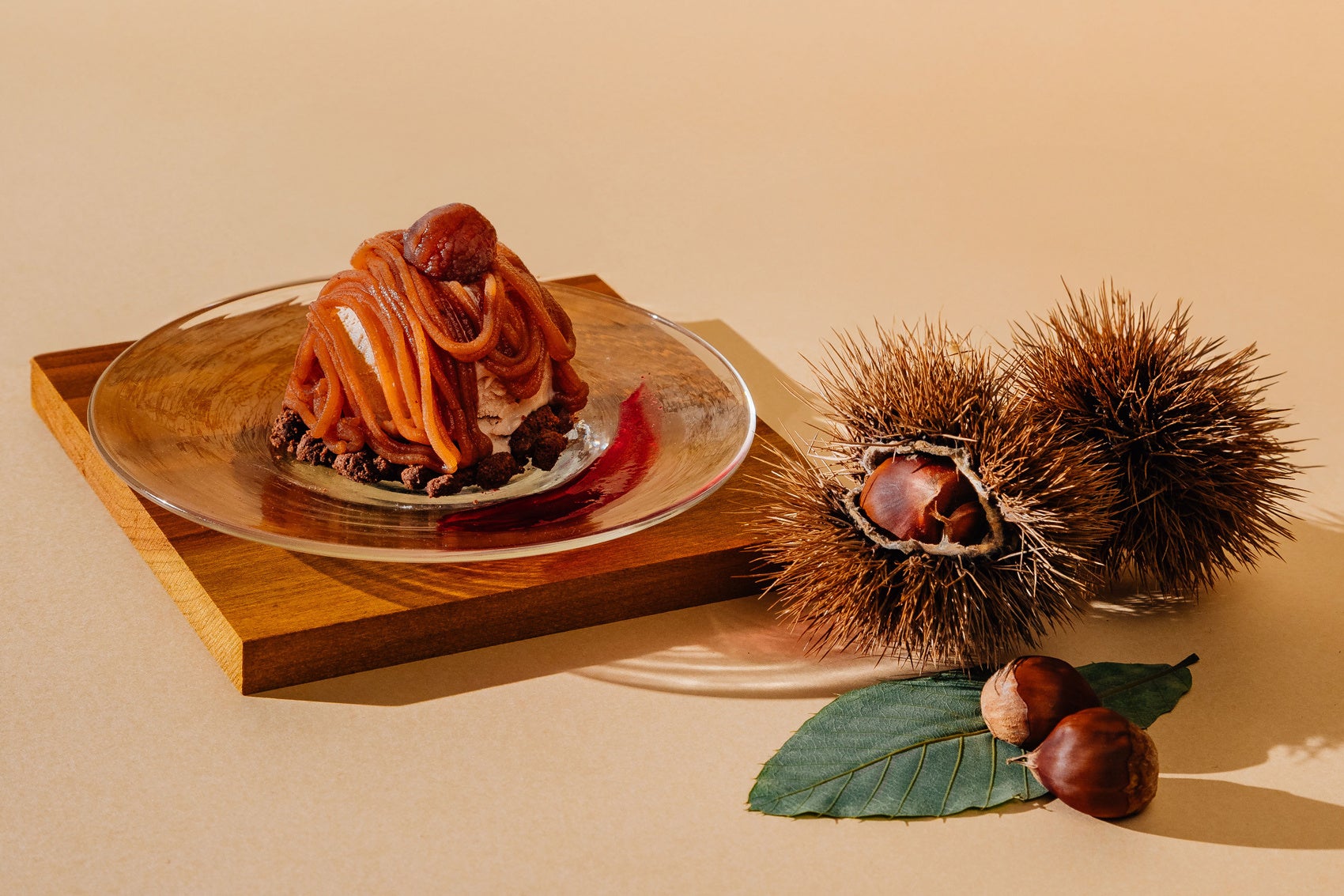 秋の王道スイーツを濃厚アイスクリームとして再構築。栗の葉とカカオニブを煮出した栗ペースト、マロンピューレを加えた栗アイス、フランス産の無添加シロップ漬マロン、ヴァローナ社のカカオを使った自家製クッキー。カシスと赤ワインで作った自家製カシスソースをアクセントに。秋の気分にぴったりな濃厚な味覚体験のできる大人のスイーツです。食べる前に冷蔵庫で10分ほど置いて、食べごろになったらまずはスプーンで一気に下まですくってお召し上がりください。