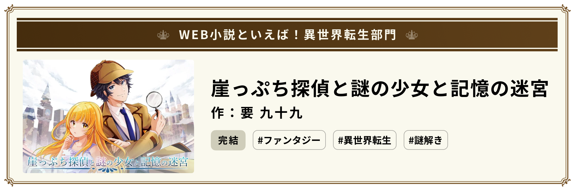 「崖っぷち探偵と謎の少女と記憶の迷宮」作:要 九十九