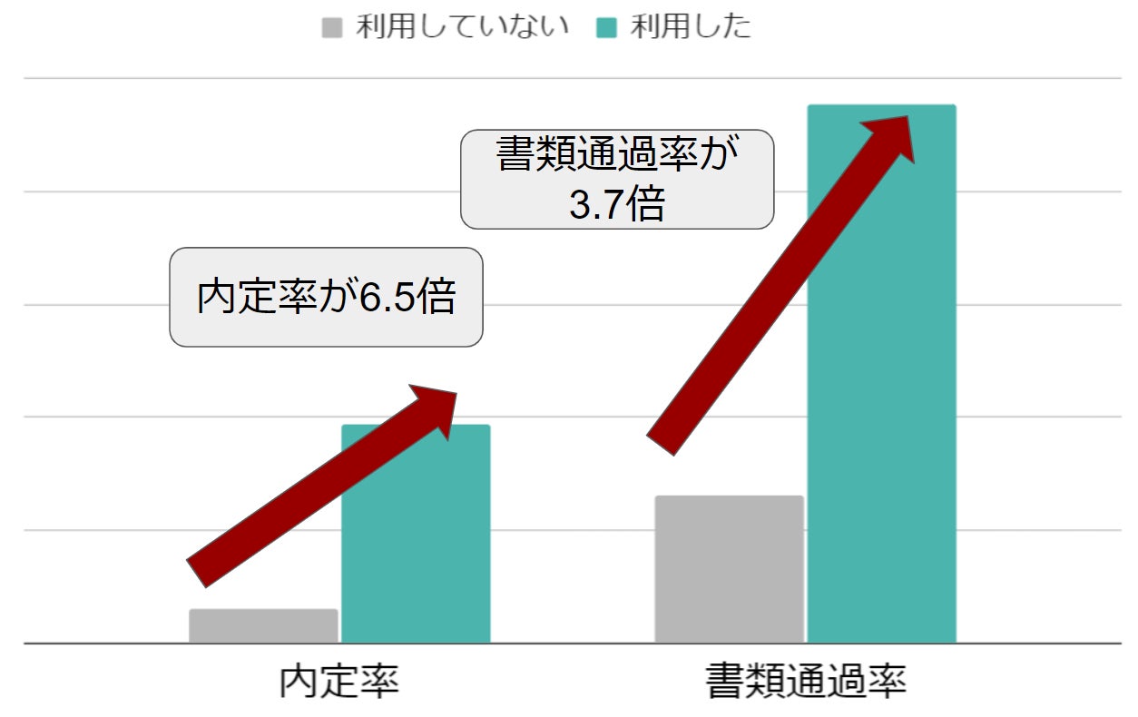 その効果について分析したところ、内定率が利用していない方の6.5倍、書類通過率も3.7倍という高い実績であることがわかりました。※3