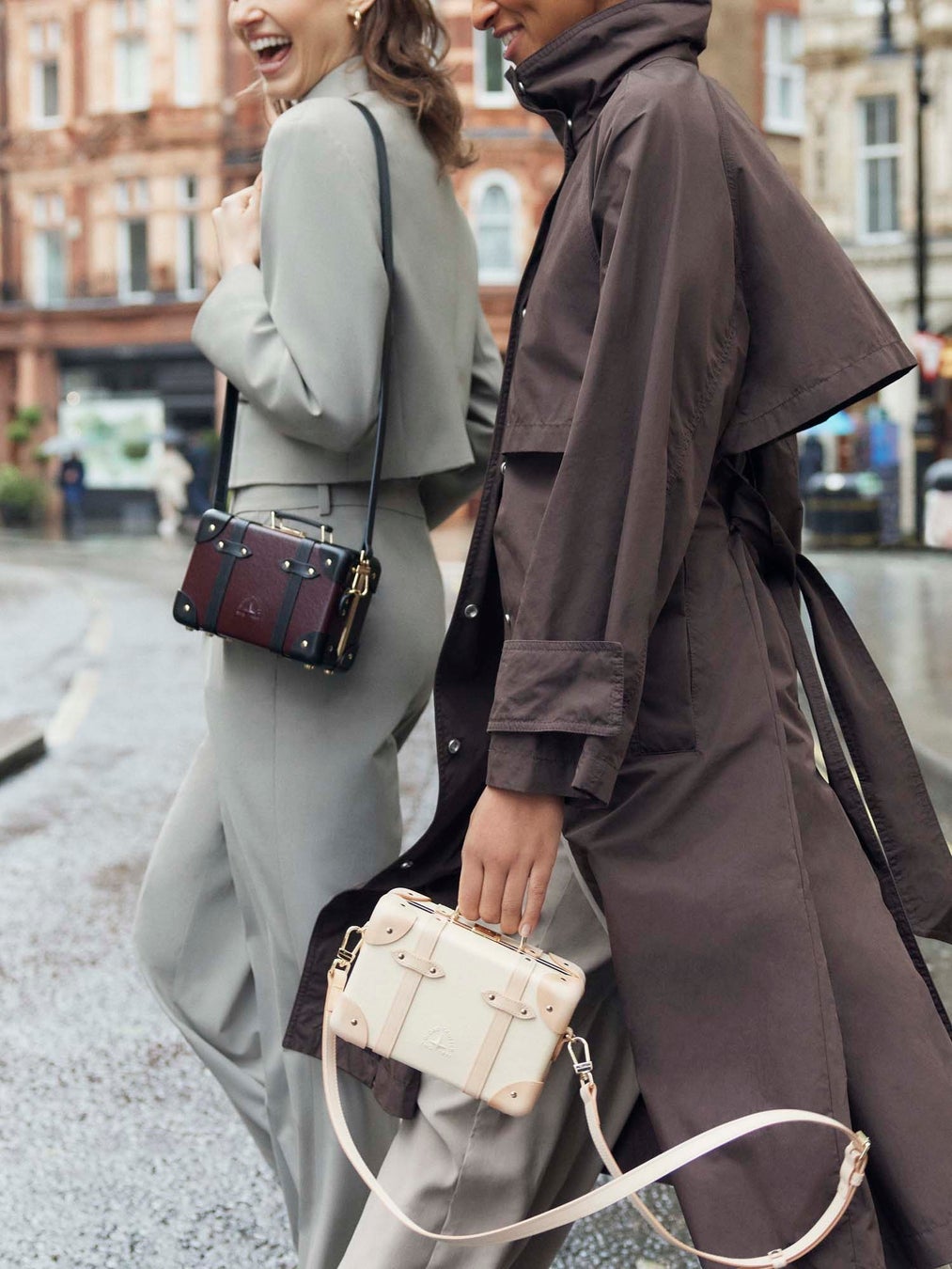 新商品「メイフェア・ケース」は同社最小のクロスボディバッグで、アイコニックなスーツケースと同様、ボディは軽量のバルカン・ファイバーを採用、コーナー、ストラップ、ハンドルにはレザーのトリミングが施されています。