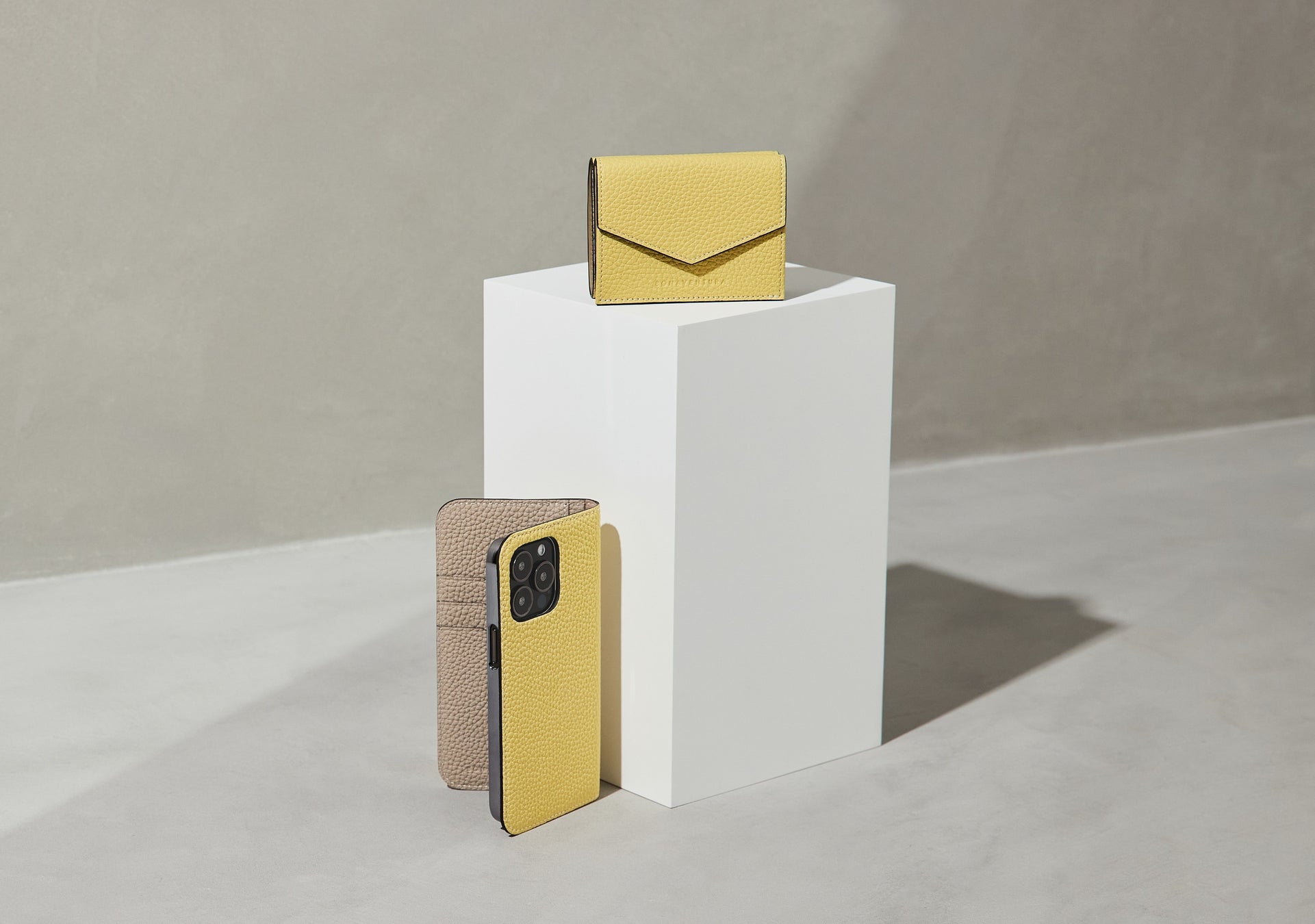 手帳型iPhoneケース、スモールウォレット、スモールバレットトレーは人気のグレージュとのバイカラーになっており、内側にグレージュカラーが入ることで落ち着いた雰囲気に。