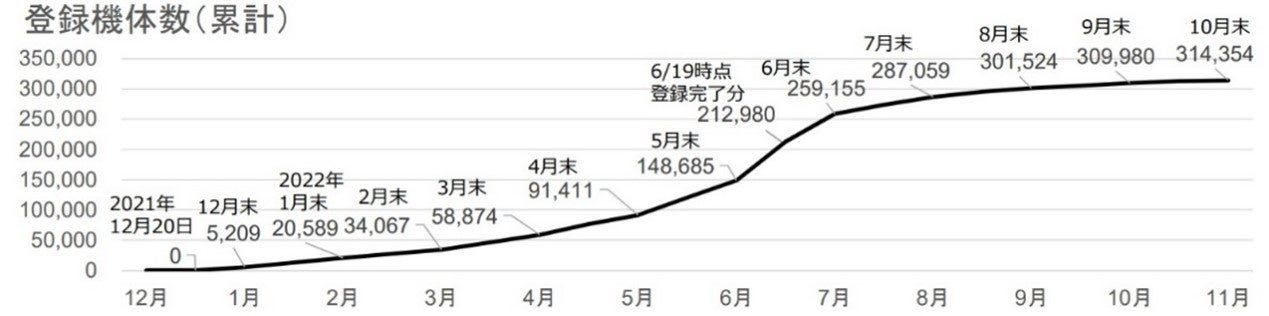 2022年6月20日以降100g以上の無人航空機の登録が義務化され、2022年10月末までに31万機以上の無人航空機が登録されています。