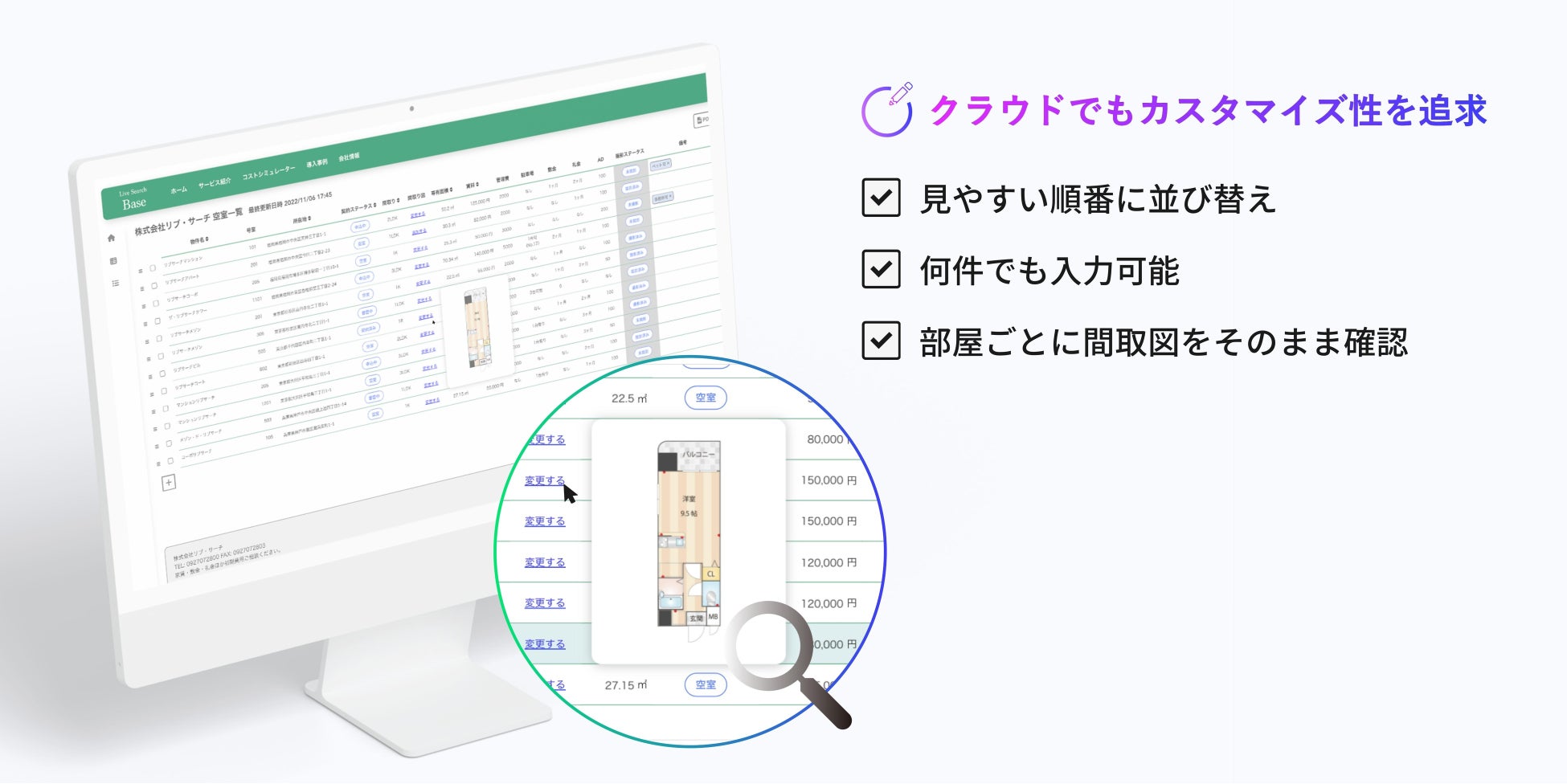 また、表示したい項目や物件の並びをカスタマイズ表示できるように行/列の並び替え機能をつけました。その他にも、ブラウザ上だからこそ可能な機能として、空室一覧上でそのまま間取図画像を確認できます。