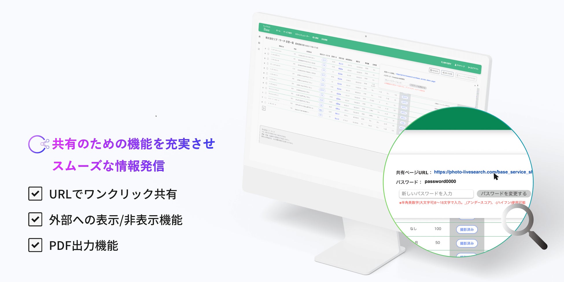 次に共有の手段として、クラウド上にある空室一覧データにアクセスできるパスワード付きURLを発行できます。このURLは、会社ホームページ等に設置することでも公開に活用できます。業者間による空室一覧の共有もこの機能を使うことでシームレスに完結します。