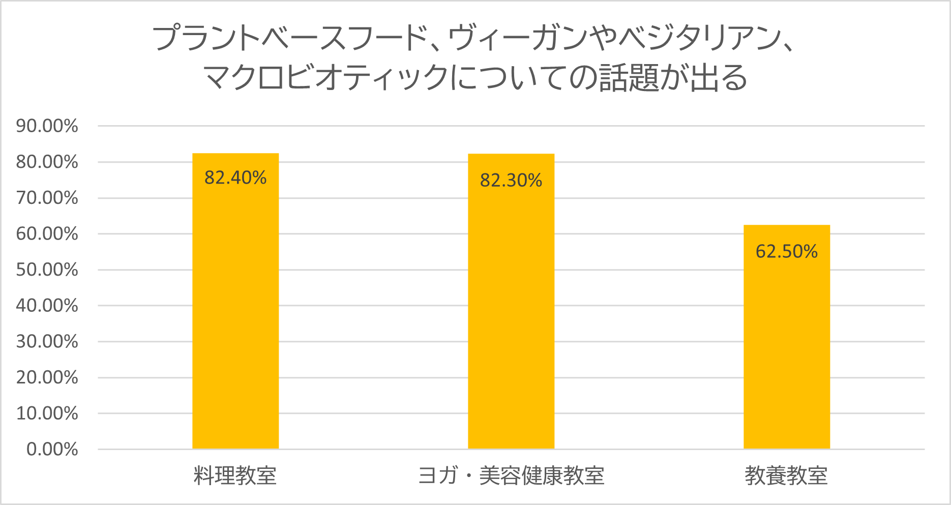 ■教室でプラントベースフード、ヴィーガンやベジタリアン、マクロビオティックについての話題が出ると回答した料理教室は82.4%、ヨガ・美容健康教室は82.3%、教養教室は62.5%であり、料理とヨガ・美容健康教室の意識が他ジャンルに比べて高いことが分かった。
