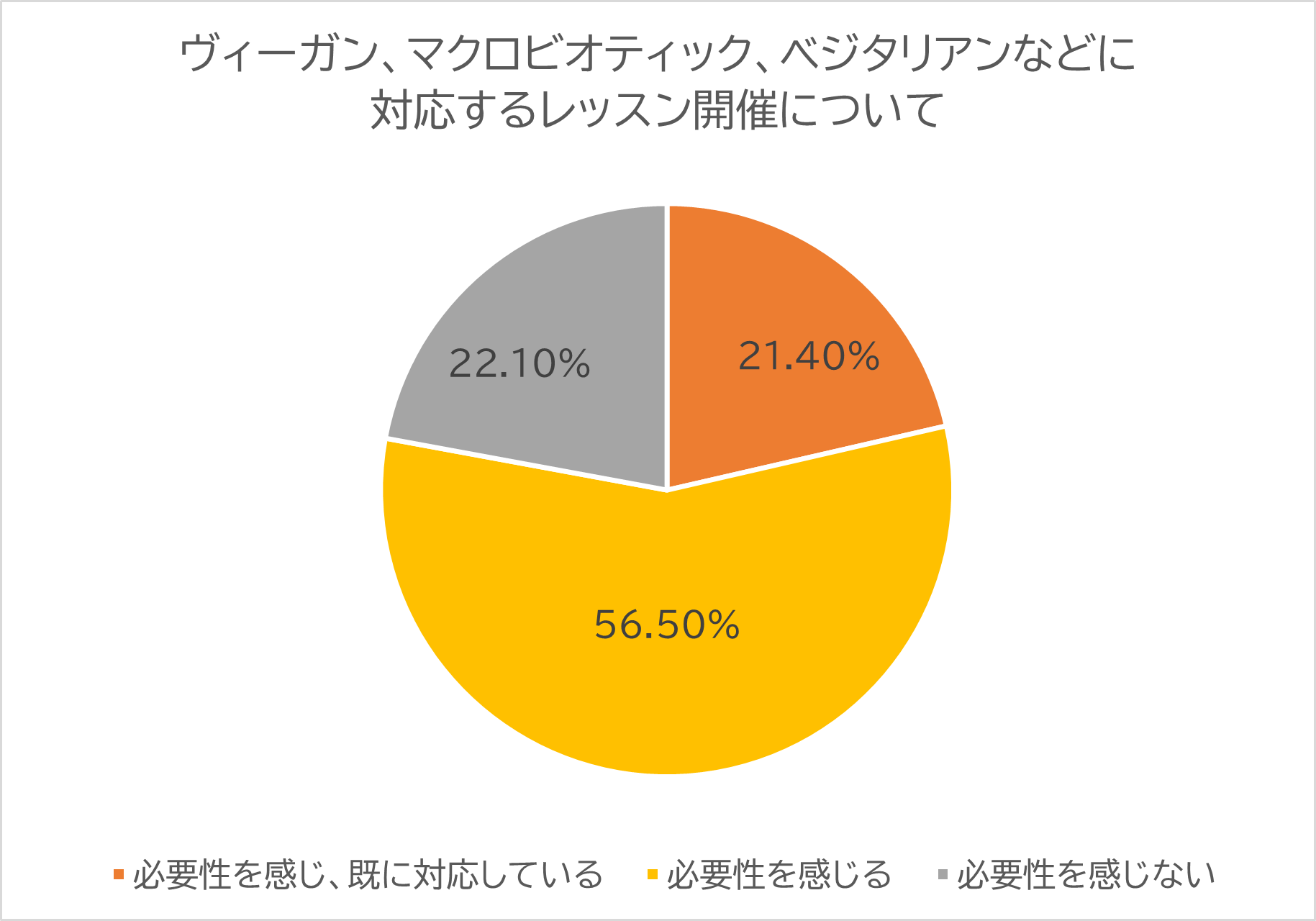 ■ヴィーガン、マクロビオティック、ベジタリアンなどに対応するレッスン開催の必要性を感じると回答した料理教室は56.5%であり、すでに対応している教室が21.4%だった。77.9%の料理教室が、必要性を感じ、行動に移している。