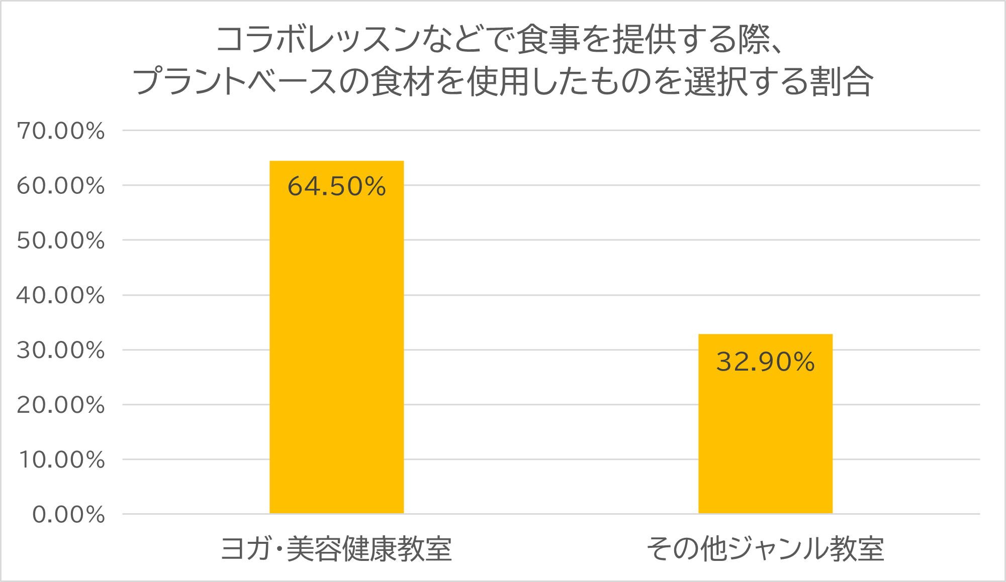 ■ヨガ・美容健康教室では、レッスン時に食事を提供する機会がある場合、64.5%の教室がプラントベースの食材を使用したものを選択すると回答。その他ジャンルでは32.9%と、大きく差が開いた。