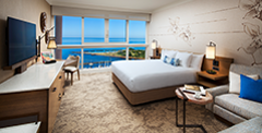 全室オーシャンフロントの客室。海や砂をイメージした落ち着いたカラーのナイオの花を描いたモダンな雰囲気のお部屋です。