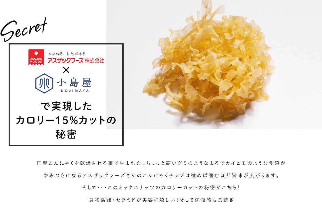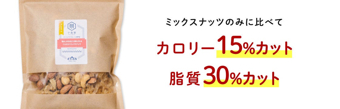 ナッツ専門店 小島屋 史上最強の満腹感!?ミックスナッツの満足感はそのままにカロリー&脂質オフを実現した噛みしめるほどに満たされる「こんにゃくたっぷりカムこんナッツ」を新発売!
