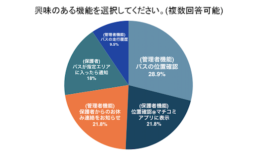 バス位置情報サービスの中で、興味がある機能を伺ったところ、全体の50%以上の方が、学校側(管理者)や保護者側からの「バスの位置管理」と回答しました。また「保護者からのお休み連絡をお知らせ」が21.8%、「バスが指定エリアに入ったら通知」と答えた方が18%という結果になりました。いずれにしても、”子どもが乗っているバスの現在地を把握したい”という学校が多いことが分かります。