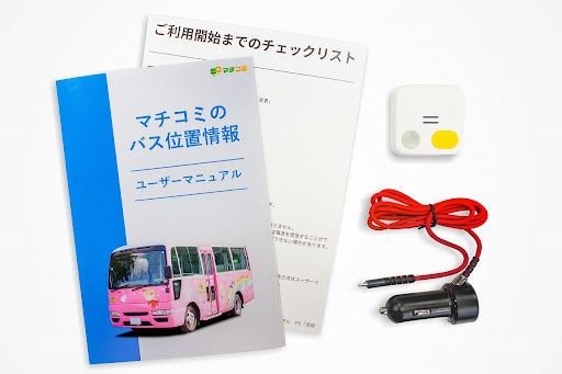 バスの位置情報の発信には小型のGPS端末を用意しました。この端末は弊社が販売する子供向け見守りGPS「みもり」で蓄積されたノウハウを元にバスの位置情報発信用として最適化しました。お届けするスタートキットには、端末だけでなく、スタートガイドやバスの充電で利用できるシガーソケットタイプの充電器が附属するので、お手元に届いてからすぐにご利用になれます。